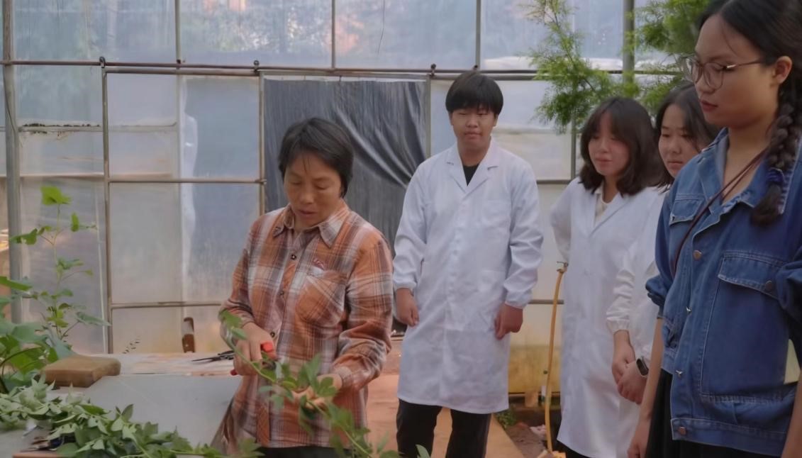 刘明凤在劳动实践课中为学生讲解花卉扦插照片。